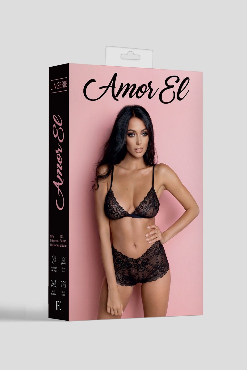 Классический кружевной комплект, состоящий из лифа без косточек и высоких шортиков. В комплекте: лиф, шорты.