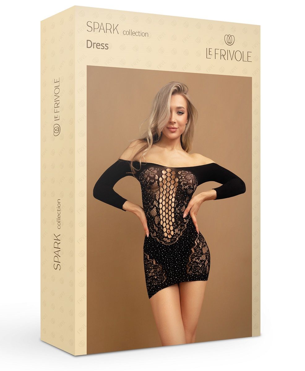 С этим коротким черным платьем с длинными рукавами, усыпанным сияющими кристаллами любое событие превратится в праздник. Узор кружева, рассредоточенный по изделию, имитирует корсет и трусики. Благодаря вырезу сверху оголяются плечи, ключицы, шея – для многих являющимися одними из самых чувственных эрогенных зон. Особый состав и плетение не сковывает движения и не перетягивает тело, а значит вам будет комфортно!