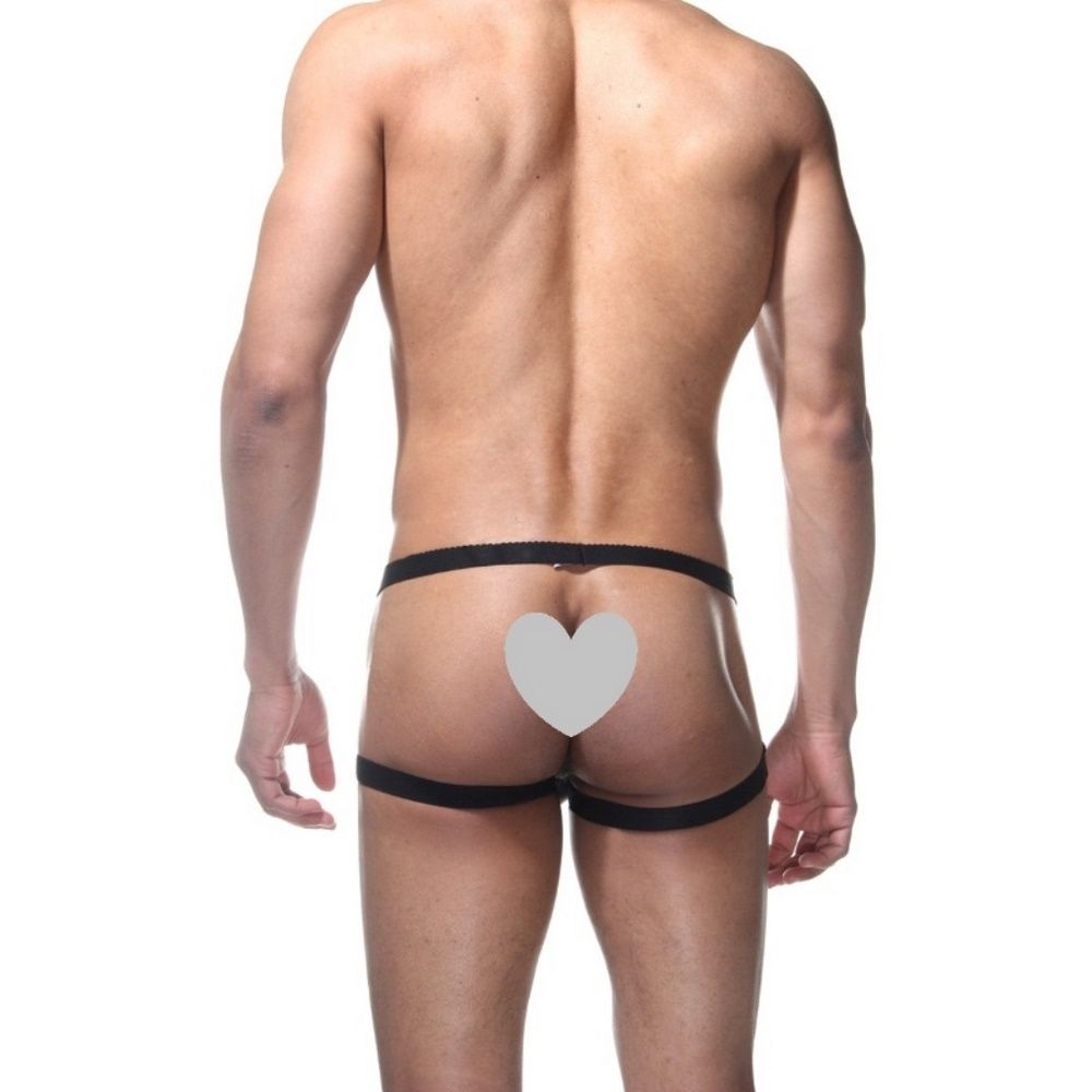 Трусы мужские из белого гладкого материала, с полностью открытыми ягодицами и черными резинками на бедрах.