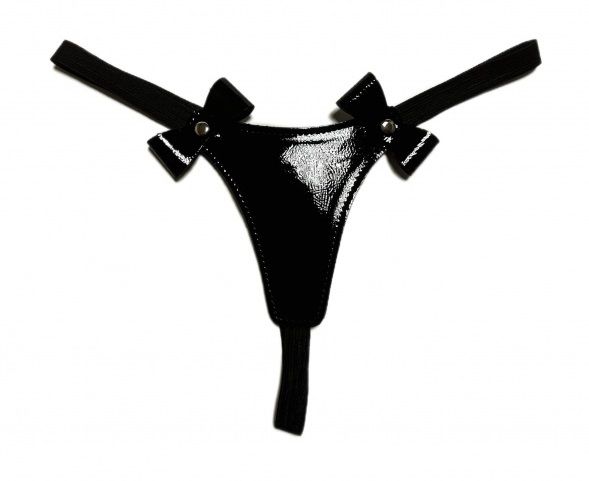Сексуальные черные стринги, выполненные из эко-кожи. Декорированы спереди двумя бантиками. Лицевая сторона выполнена из лакового материала, а внутренняя из матового. Благодаря эластичной резинке, отлично сядут по фигуре, подойдут на размеры 40-46. Очень красивая и удобная модель, которая поможет создать дерзкий сексуальный образ для вашей любовной игры!