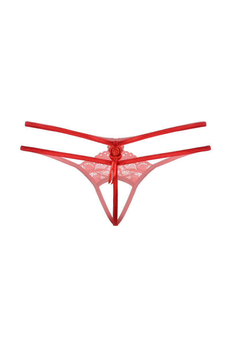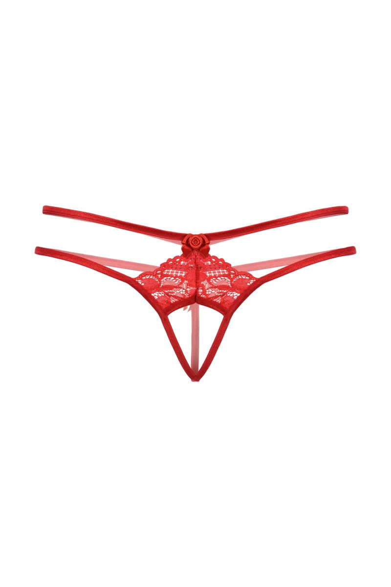 Благодаря фасону этих трусиков-стринг с розочкой, мужчина сразу поймёт: вы - та еще штучка! Оригинальное кружевное бельё на тонких бретелях лишний раз подчеркнёт красоту ваших бёдер, их пленительные объемы! Пикантный вырез снизу продемонстрирует любимому бархатистость вашей кожи, а также тот жар, что таится внутри.