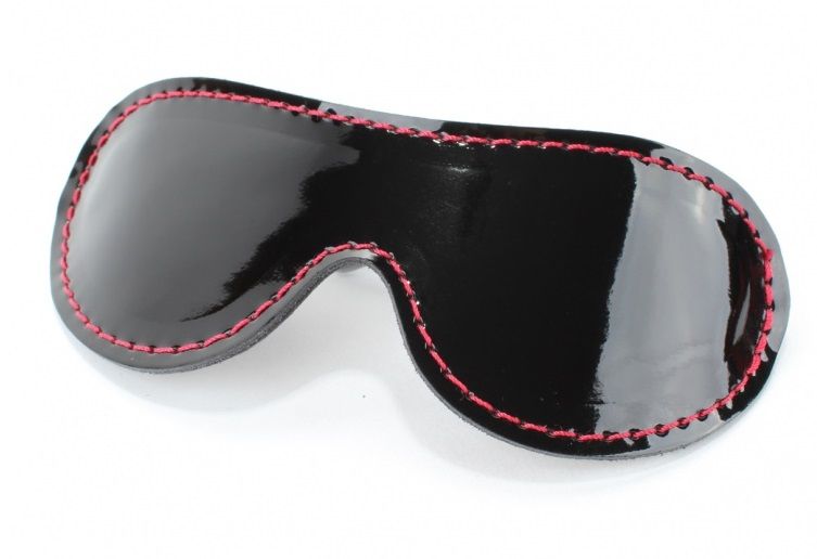 Чёрная перфорированная маска из кожи с красной строчкой.