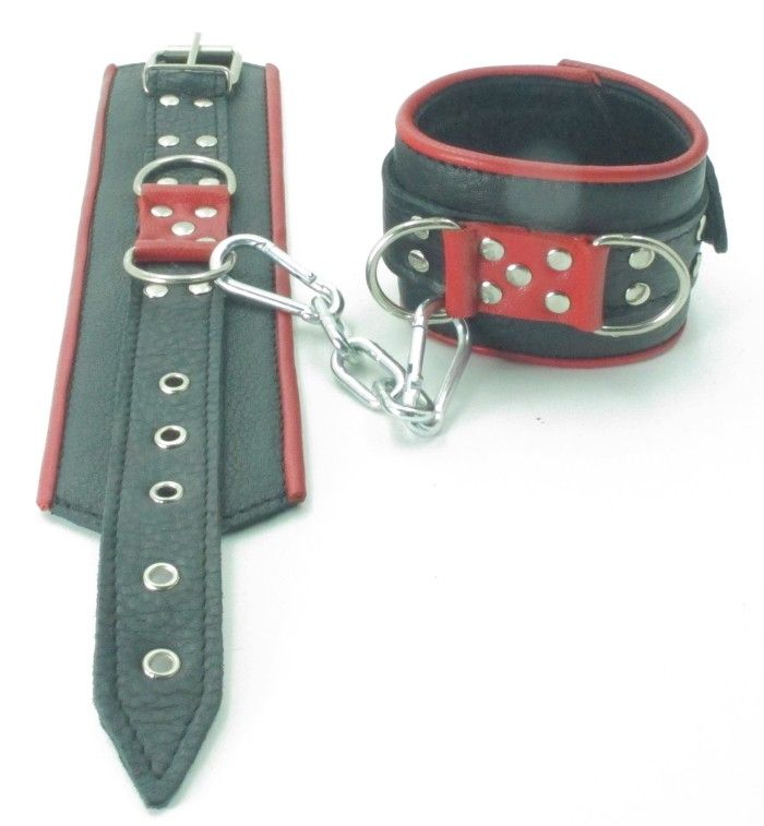 Сильные наручники в красно-черном цвете. Украшены заклепками и соединяются между собой цепью с карабинами. Размер наручников регулируется при помощи застежки. Ширина - 6 см. Длина цепочки - 13 см.