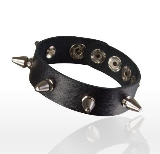 Узкий браслет из плотной натуральной высококачественной кожи черного цвета, украшенный пятью серебристыми металлическими шипами, не только является атрибутом для эротических ролевых игр и практик БДСМ, но и стильным украшением для ношения. Ширина - 2 см.