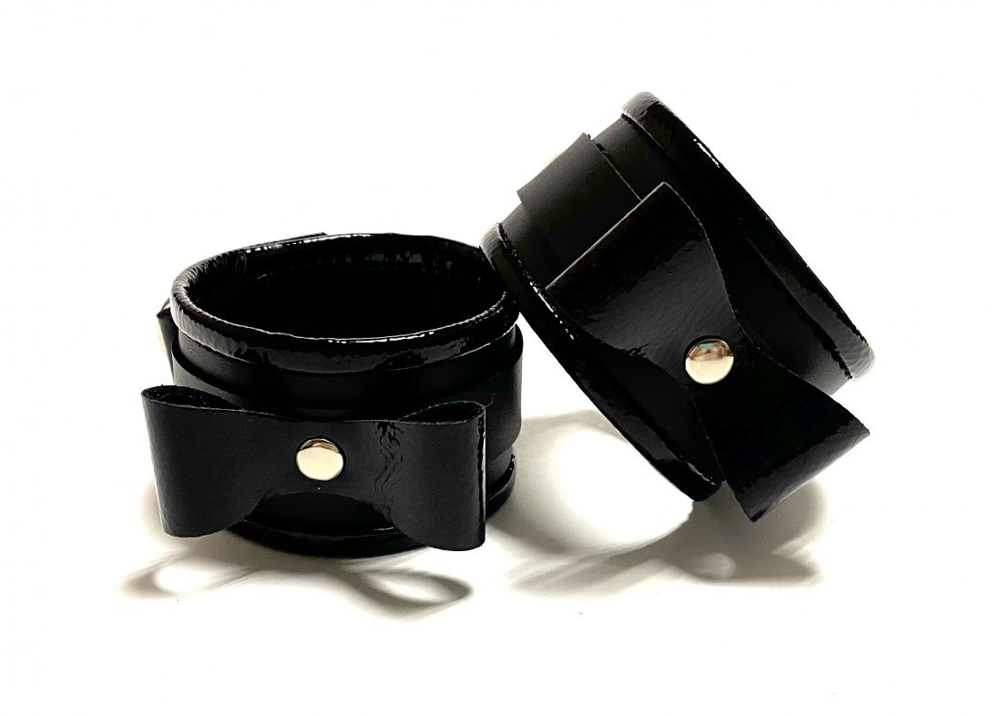 Красивые и функциональные наручники черного цвета, выполненные из искусственной кожи. Декорированы металлической фурнитурой, лаковыми бантиками и вставками по краям. Обхват удобно регулируется с помощью пряжек. В комплекте идет соединение с карабинами. Очень экономичный, экологичный и практически незаменимый аксессуар для вашей любовной игры! Ширина - 4,5 см. Длина соединения - 11 см.