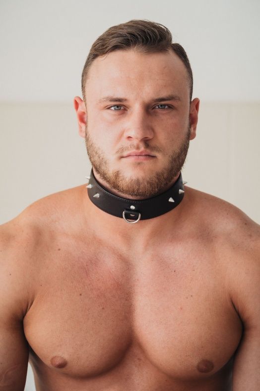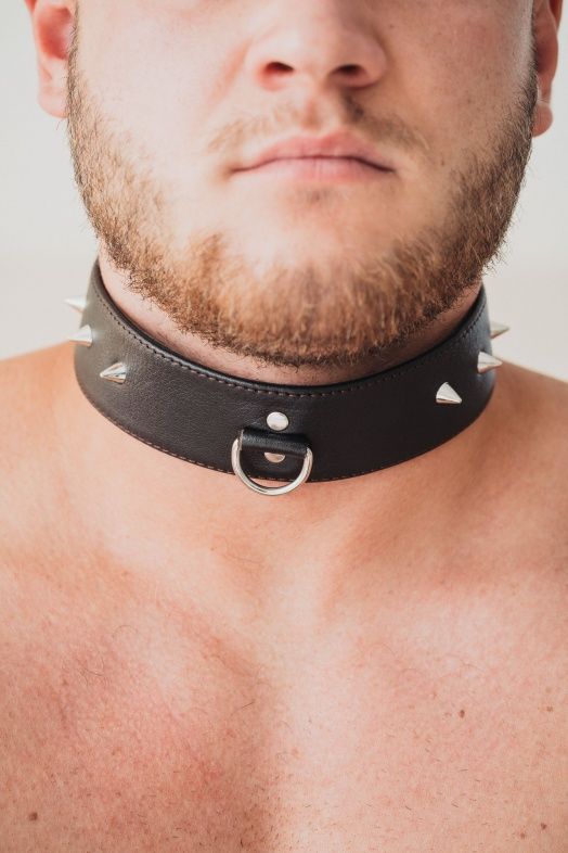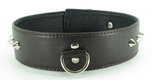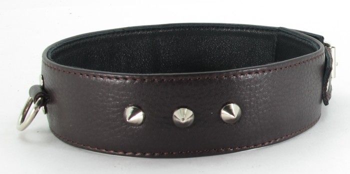 Коричневый кожаный ошейник с кольцом увеличенного размера.