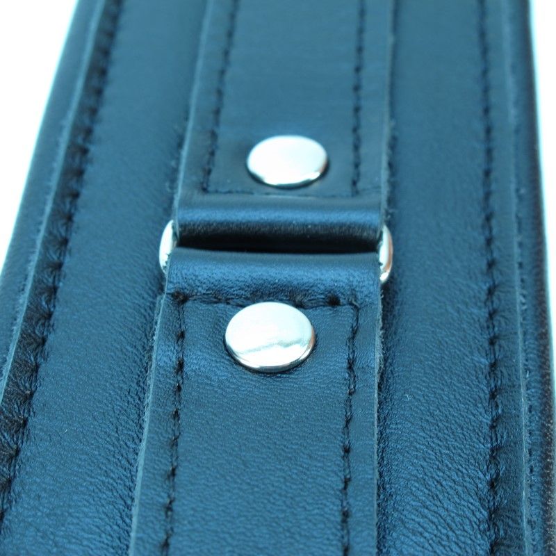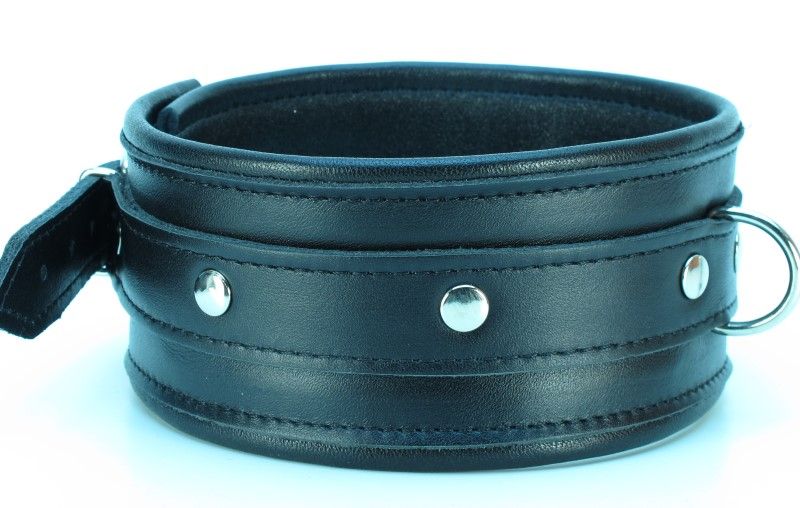 Черный кожаный ошейник с декоративными кнопками. Имеет D-кольцо для карабина. Имеет 5 отверстий для регулировки размера. Ширина - 5,5 см.