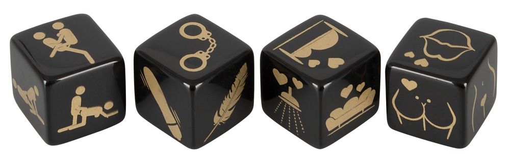 Игральные кубики - 4 штуки в наборе. С золотистым принтом. Мотивы - позиции, место, аксессуары и область тела.