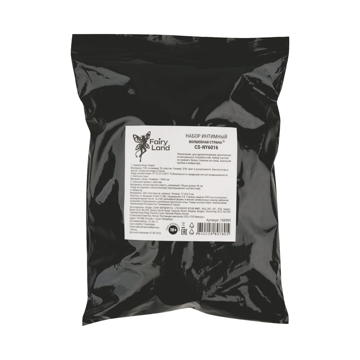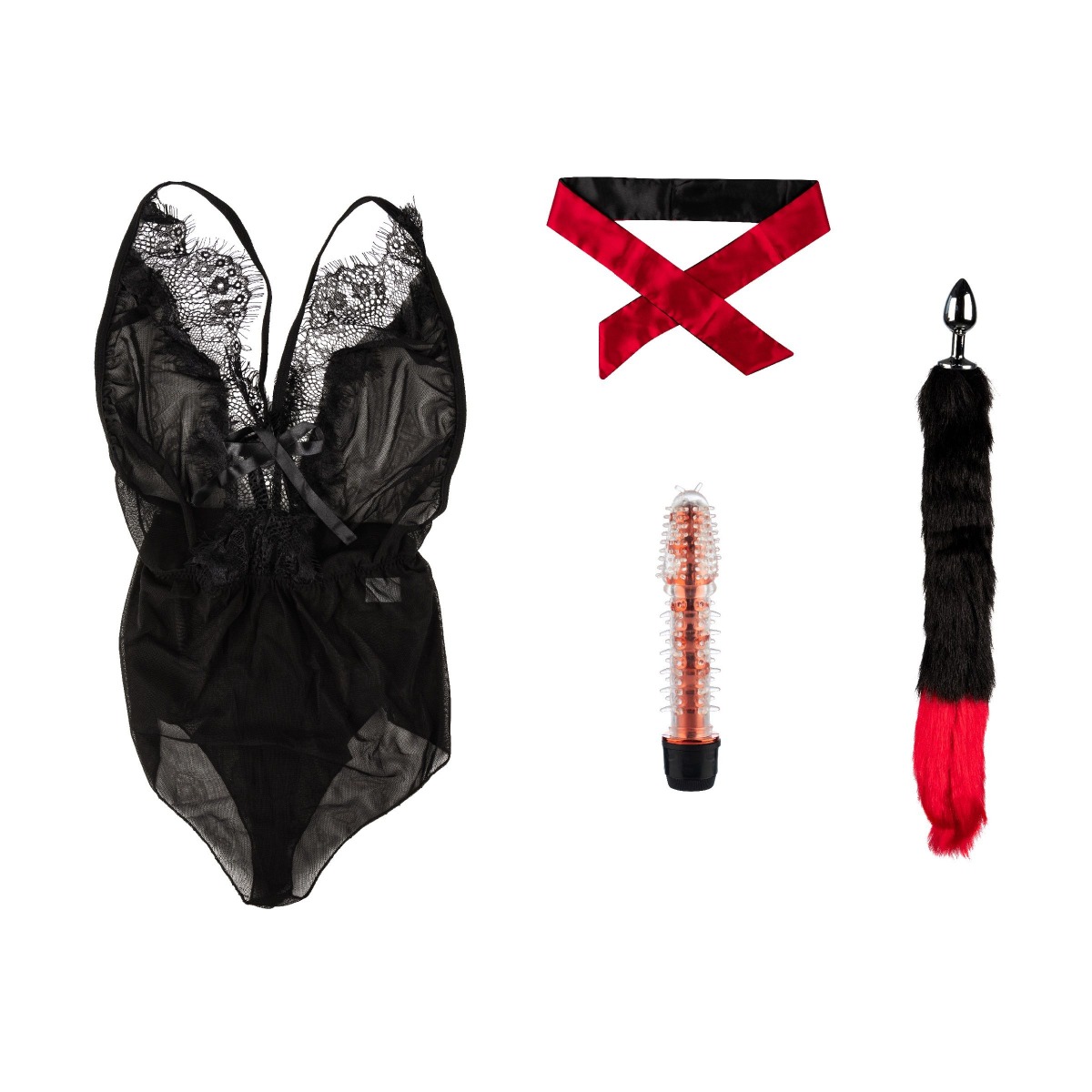 Набор состоит из нижнего белья (боди размера S-M), сатиновой повязки на глаза, металлической анальной пробки с хвостом из искусственной шерсти и силиконового вибратора с шипами. Возбуждающее нижнее белье наряду с секс-игрушками возбудит каждого мужчину, внесет в ролевые игры разнообразие. Без косточек и пуш-ап. Открытая спина и плечи. Трусы в форме бразилиана. Эротическая лента - это особый аксессуар, который выглядит очень невинно. Используется для фиксации партнера, ваших рук, ног и туловища - отличный способ разнообразить вашу сексуальную жизнь, который нравится обоим партнерам. Лента мягко фиксирует запястья или лодыжки вашего партнера, ее можно использовать для связывания, в качестве повязки на глаза или как предмет одежды. Мягкий материал ленты не обжигает кожу и не вызывает дискомфорта во время игры, вы можете полностью отдаться страсти без последствий, лента не оставляет следов после любовной игры. Анальная пробка с хвостом придаёт незабываемые ощущения от двойного проникновения. Конусообразная форма обеспечивает комфортное введение. Дополняет игривый образ. За счёт рельефной формы и мягких силиконовых усиков, вибратор подходит для стимуляции вагины, клитора, сосков и других эрогенных зон. Материал боди: 95% полиамид, 5% эластан. Длина ленты - 120 см, ширина - 6 см. Длина пробки с хвостом - 46 см, диаметр - 2,6 см. Длина вибратора - 17,5 см, диаметр - 3,5 см.