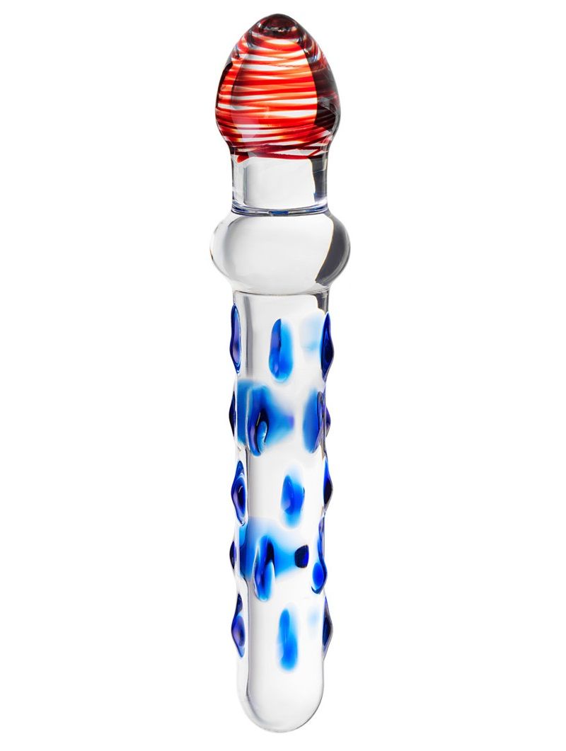 Этот стеклянный фаллос позволит вам почувствовать себя настоящим экспериментатором. Ведь у него две стороны – разных как по форме, так и по рельефу. Захотите, и в вас вторгнется большая, чуть заострённая головка с красными спиралями внутри. Или гладенький ствол, сплошь покрытый продолговатыми голубыми шишечками. Каким бы ни был выбор, ярким ощущениям – быть! Длина - 19 см.